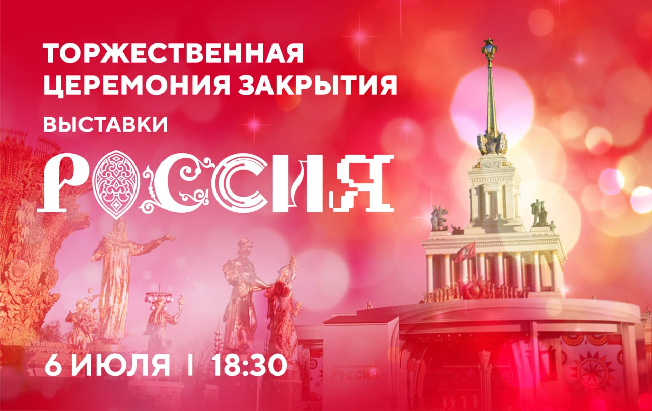 Приглашаем вас на торжественную церемонию закрытия, которая пройдет 6 июля на Главной уличной сцене. Поздравить гостей приедут любимые артисты: SHAMAN, Григорий Лепс, Олег Газманов, ST, Пелагея, Наталья Подольская, Аскар Абдразаков, Алексей Воробьев и многие другие. Мероприятия пройдут также на площадке перед Павильоном № 1 и у фонтана "Дружба народов".